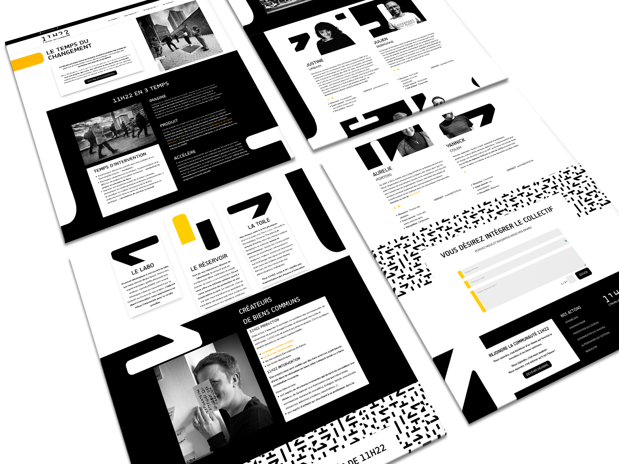 - la palette de couleurs (le blanc, le noir ponctué de jaune chaleureux) détourne les codes du secteur de la construction pour souligner la nature de la méthodologie 11H22 ;
